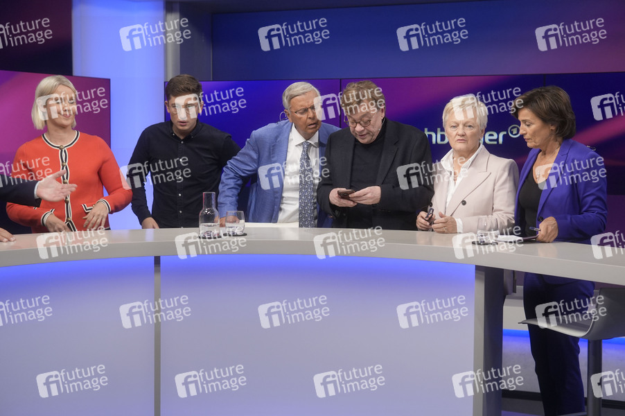 Nicole Diekmann, Philipp Türmer, Wolfgang Bosbach, Bela Rethy, Renate Künast und Sandra Maischberger in der ARD-Talkshow 'maischberger' im Studio Berlin Adlershof. Berlin, 01.10.2024