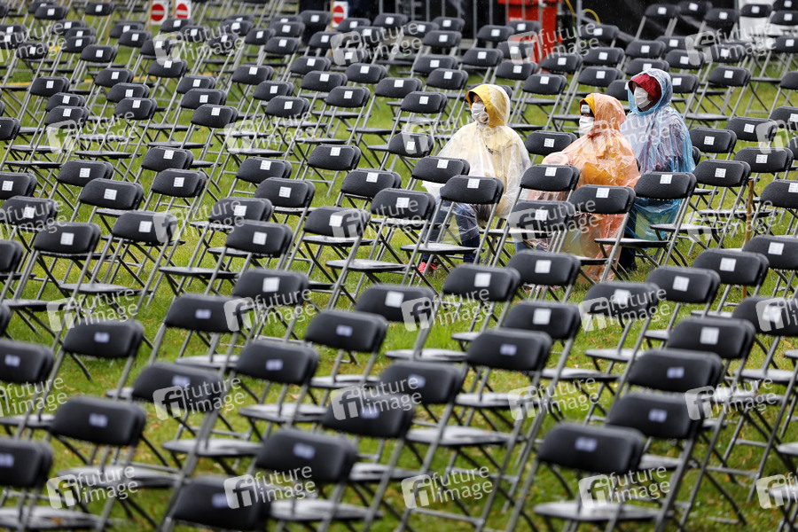 Fans von Helge Schneider harren bei Regen in den Stuhlreihen des Bonner Kunstrasen mit Gesichtsmasken aus. In NRW will das Land mit dem Inkrafttreten der neuen Coronaschutzverordnung verstärkt auf das Einhalten der 3G-Regel bei Konzerten und Events setzen und damit einen weiteren Schritt in Richtung Normalität tun. (Themenbild, Symbolbild) Bonn, 17.08.2021