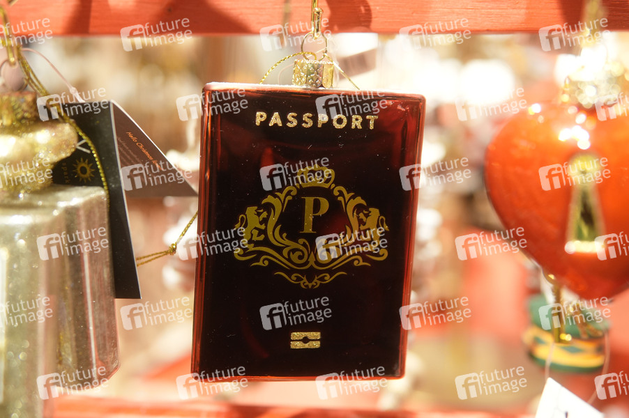 Passport-Weihnachtsbaumanhänger auf dem City-Weihnachtsmarkt an der Gedächtniskirche auf dem Breitscheidplatz. Berlin, 16.12.2024
