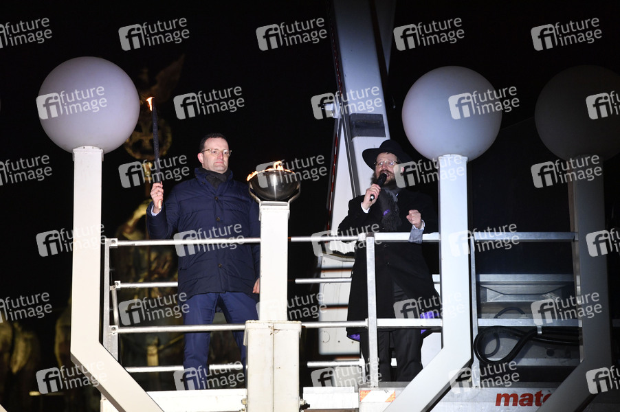 Jens Spahn und Rabbiner Yehuda Teichtal beim Zünden der ersten Kerze am Chanukka-Leuchter anlässlich der beginnenden Chanukka-Feiertage am Brandenburger Tor. Berlin, 10.12.2020