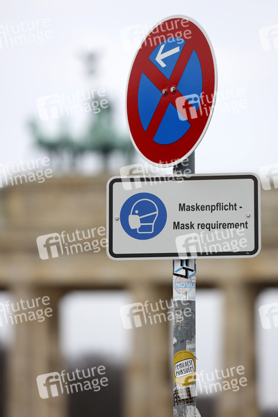 Harter Lockdown zu Ostern: Stimmen werden laut nach einem harten und konsequenten Lockdown. Es seien schärfere Corona-Maßnahmen nötig, um die Pandemie einzudämmen, meinen Ärzte wie Weltärztepräsident Montgomery. Im Bild ein Schild, welches auf Maskenpflicht am Pariser Platz vor dem Brandenburger Tor hinweist. (Themenbild, Symbolbild) Berlin, 31.01.2021