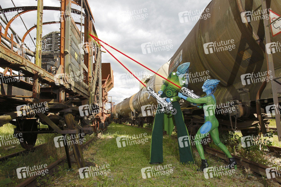 Cosplay, Cosplayer, Bodypainting, Body-Painting, Make-up, Latexappliaktionen, Maskenbildnerei, Körperkunst, Körperfarben, Projekt Farbkörper, Farbe, Bemalung, Kunst, Malerei, Außerirdische, Besucher, Invasion, Science Fiction, nackt, Erkundung, Bahn, Gleise, Bahngleise, Waffe, Waffen, Strahlengewehr, Waggons, Bahnwaggon, Güterbahnhof, body painting, body art, project color body, colors, nude, naked, alien, aliens, tracks, railroad tracks, wagons, railway wagons, freight station, weapon, weapons, ray gun, vistor, visitors