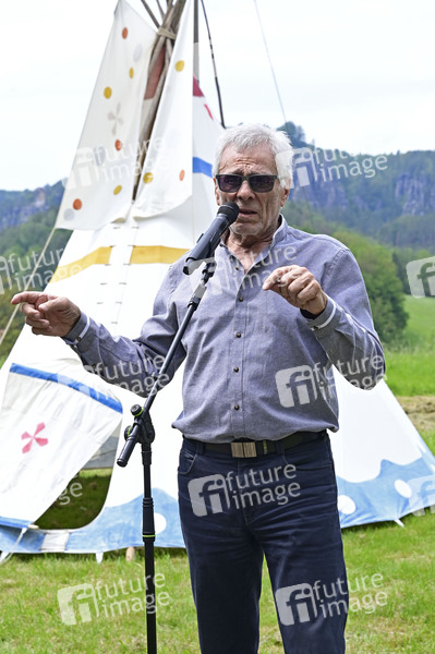 Gojko Mitic bei der offiziellen Einweihung einer Sandstein-Stele in der Nähe des Originaldrehortes des Filmes 'Die Söhne der großen Bärin' im Kurort Rathen. Rathen, 19.05.2024