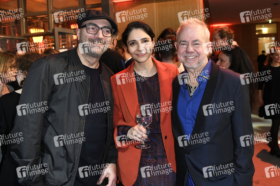 Tobi Baumann, Pegah Ferydoni und Helmut Zerlett beim 21. NRW Empfang des Landes NRW und der Film- und Medienstiftung NRW im Rahmen der Berlinale 2024 in der Vertretung des Landes Nordrhein-Westfalen. Berlin, 18.02.2024