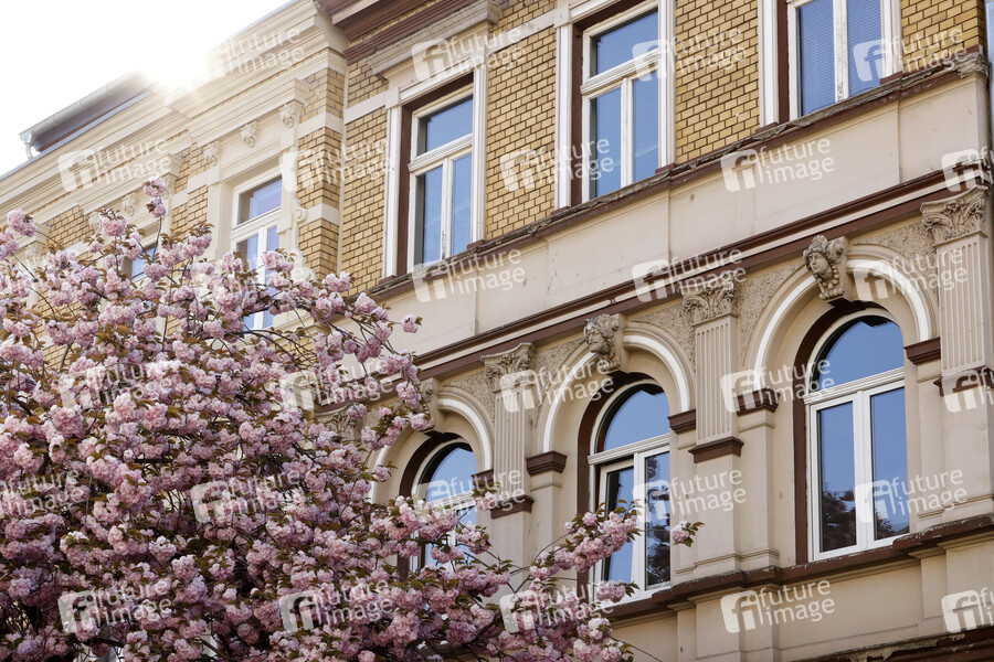 Passanten, Anwohner und Touristen bewundern die alljährliche Bonner Kirschblüte in der Bonner Altstadt rund um die Heerstraße. In diesem Jahr darf das Naturschauspiel nur unter Einhaltung strenger Corona-Maßnahmen beobachtet werden. Ordnungsamt und Polizei kontrollieren die Einhaltung von Maskenpflicht und Mindestabstand in den Gassen. Wenn der Andrang zu groß wird, sollen einzelne Straßen auch gesperrt werden. Bonn, 22.04.2021