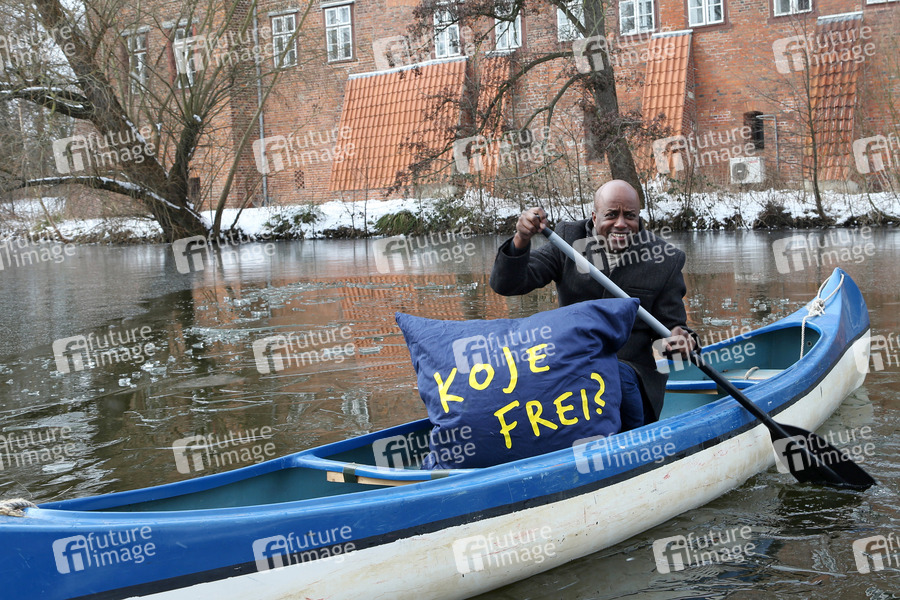 Yared Dibaba paddelt auf dem Schloßteich für die Aktion 'Koje frei?' um für Unterkünfte für Teinehmer der Kirchentags zu werben. Winsen an der Luhe, 13.03.2013