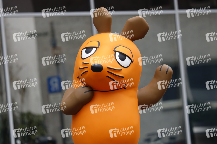 Anlässlich des 50. Geburtstag der Kindersendung 'Die Sendung mit der Maus' steht eine große Mausfigur vor dem WDR in der Innenstadt, damit sich Passanten mit ihr fotografieren können. Köln, 10.03.2021