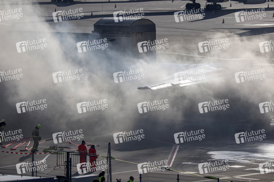 Explosion am Flugzeug bei der Notfallübung der Werkfeuerwehr, der Feuerwehr Köln und den Hilfsorganisationen am Flughafen Köln/Bonn. Im Rahmen der Übung wird die Kollision eines Flugzeugs mit einem Passagierbus und einer Abfertigungshalle simuliert. Einsatzkräfte retten aus dem in Brand geratenen Flugzeug und dem Gebäude Personen und versorgten diese. Köln, 06.11.2021