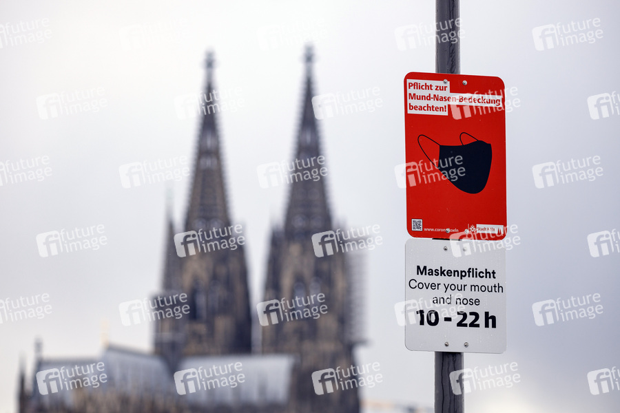 Maskenpflicht, Masken, Maske tragen, Mund-Nasen-Bedeckung, Mund-Nasen-Schutz, MNS, FFP2, medizinische Masken, Stoffmasken, Behelfsmasken, Corona, Virus, Coronavirus, Coronaviren, Schild, Hinweis, Hinweisschild, Corona-Maßnahmen, Corona-Politik, Coronamaßnahmen, Corona-Regeln, Coronaregeln, Kölner Dom, dritte Welle, zweite Welle, Kontaktbeschränkungen, Kontaktverbot, Corona-Kontrollen, Ordnungswidrigkeit, Grenzwert, Grenzwerte, Inzidenz, Inzidenzwert, Inzidenzwerte, Gesundheit, Hygiene, Neuinfektionen, R-Wert, Inzidenzzahl, Maskenzwang, Infektionsschutzgesetz, Infektionsschutz, 7-Tage-Inzidenz, Gesundheitspolitik, Zeitgeschichte, Corona-Auflagen, Lockdown, Lock Down, Symbolbild, Symbolfoto
