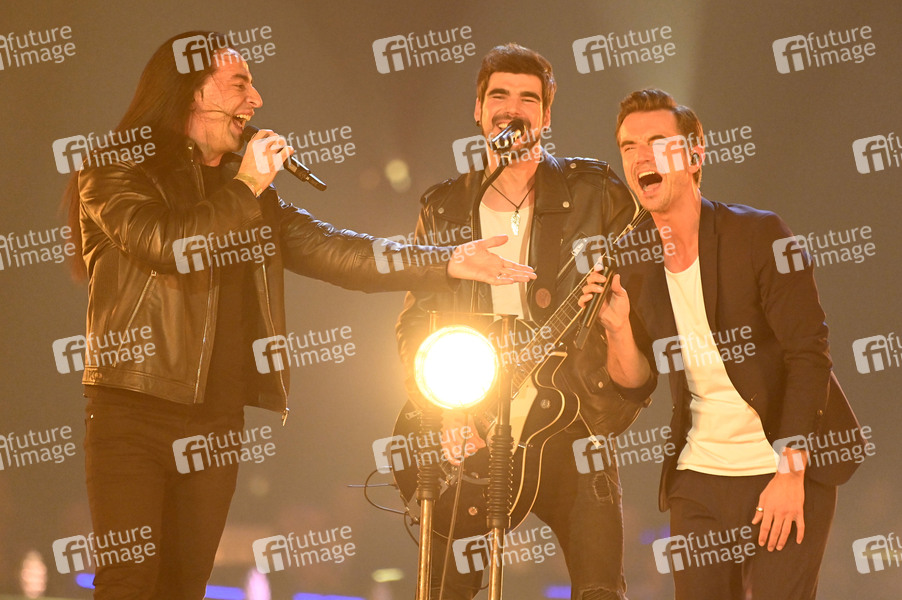 Bülent Ceylan, Martin Goldenbaum (Brenner) und Florian Silbereisen in der TV Show 'Schlagerbooom 2021 - Alles funkelt! Alles glitzert!' in der Dortmunder Westfalenhalle. Dortmund, 23.10.2021