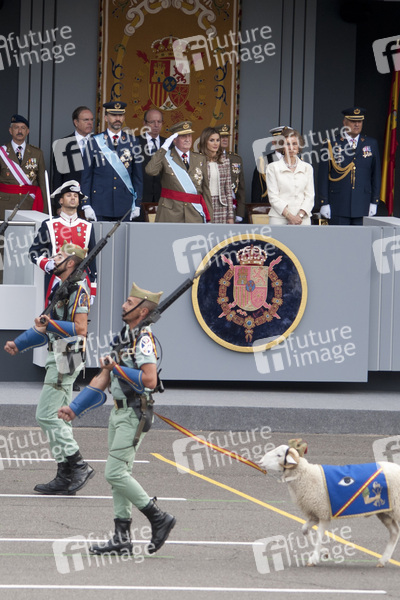Die spanische Königsfamilie bei der Hommage an die Nationalflagge mit Militärparade am Palacio Real, Madrid