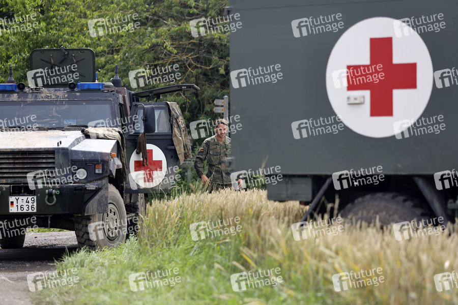 In der Eifel haben heftige Regenfälle und Dauerregen für Überschwemmungen und Überflutungen gesorgt. Im Ahrtal trat der Fluss vielerorts über die Ufer und überschwemmte nicht nur Keller sondern ganze Ortschaften. Im Bild das Camp der Rettungskräfte in den Bergen über dem Ort Dernau (Landkreis Ahrweiler), der beinahe komplett von den Wassermassen geflutet wurde. Viele Menschen verloren alles. Dernau, 15.07.2021