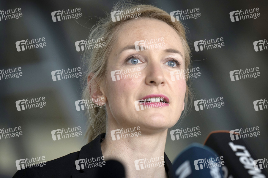 Ines Schwerdtner bei einem Pressestatement der Bundestagsfraktion der Partei Die Linke im Reichstagsgebäude. Berlin, 09.04.2025
