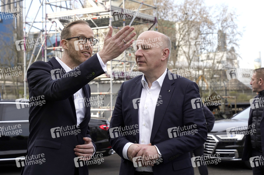 Christian Feuerherd und Kai Wegner bei der Grundsteinlegung einer Abwassergroßwärmepumpe von Vattenfall und Befüllen einer Zeitkapsel auf dem Kraftwerksgelände Reuter-West. Berlin, 12.03.2024
