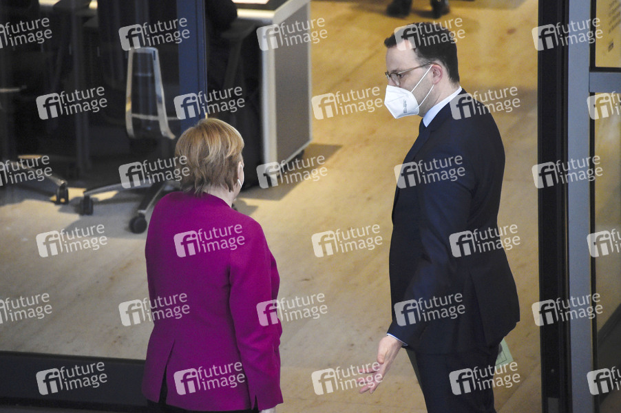 Angela Merkel und Jens Spahn in der 218. Sitzung des Deutschen Bundestages im Reichstagsgebäude. Berlin, 25.03.2021