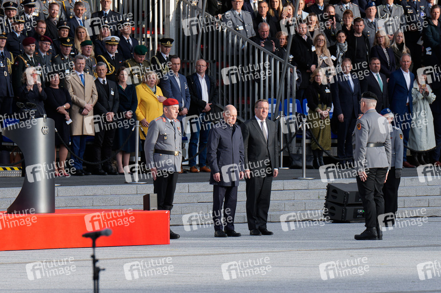 Carsten Breuer, Olaf Scholz und Boris Pistorius bei der Würdigung der Mali-Einsätze mit zentralen Abschlussappell und einer Serenade mit allen deutschen Kontingentführern, internationalen Gästen sowie Angehörigen und Hinterbliebenen von deutschen Einsatzsoldaten, die in Mali gedient haben, auf dem Paradeplatz des Bundesministeriums der Verteidigung. Berlin, 11.04.2024