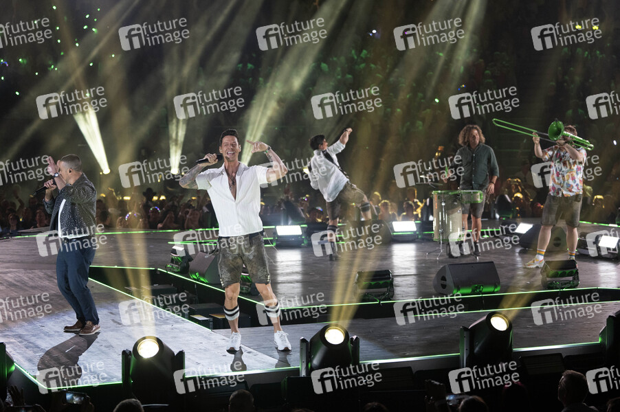 Die Draufgänger und Pietro Basile in der TV-Show 'Schlagerbooom Open Air 2025 - Die Berge leuchten!' live aus dem Stadion Kitzbühel. Kitzbühel, 21.06.2025