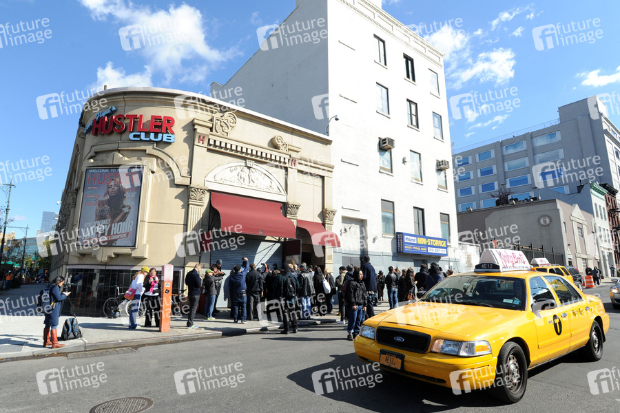 Banksy Graffiti auf dem Rolltor des Haupteingangs von Larry Flints Hustler Club in Hell's Kitchen als Teil seiner einmonatigen Aktion 'Better out than in'. New York, 24.10.2013