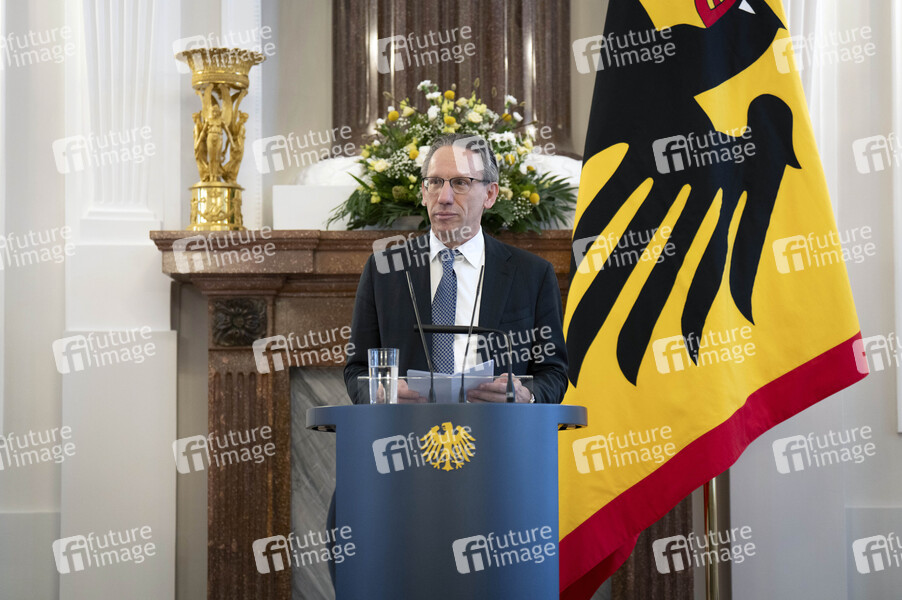 Jörg Kukies bei der Übergabe der Wohlfahrtsmarken 2025 durch den Bundesminister der Finanzen an den Bundespräsidenten im Schloss Bellevue. Berlin, 21.02.2025