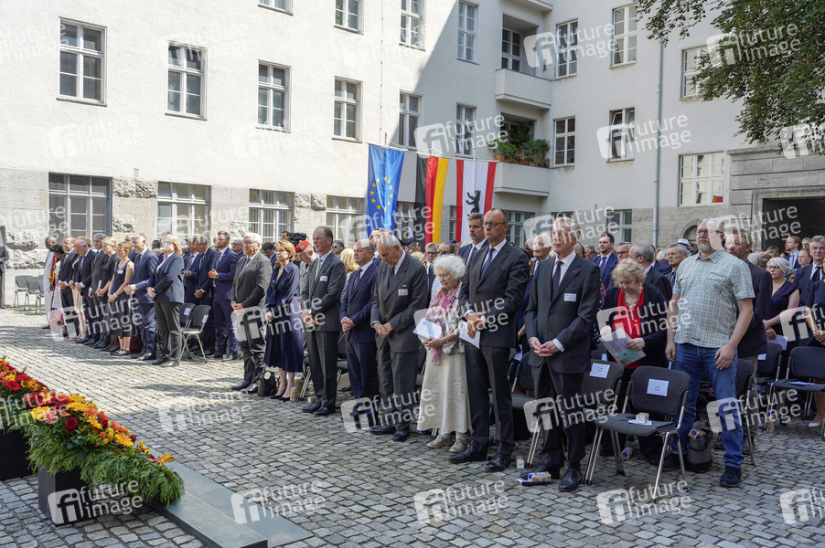 Frank-Walter Steinmeier, Elke Büdenbender, Valerie Riedesel Freifrau zu Eisenbach, Philipp Riedesel Freiherr zu Eisenbach, Olaf Scholz, Berthold Maria Schenk Graf von Stauffenberg, Mechthild Schenk Gräfin von Stauffenberg, Friedrich Merz und Axel Smend bei der Gedenkveranstaltung zum 80. Jahrestag des Aufstands gegen Nationalsozialistische Gewaltherrschaft mit Kranzniederlegung auf dem Ehrenhof des Bendlerblocks.Berlin, 20.07.2024