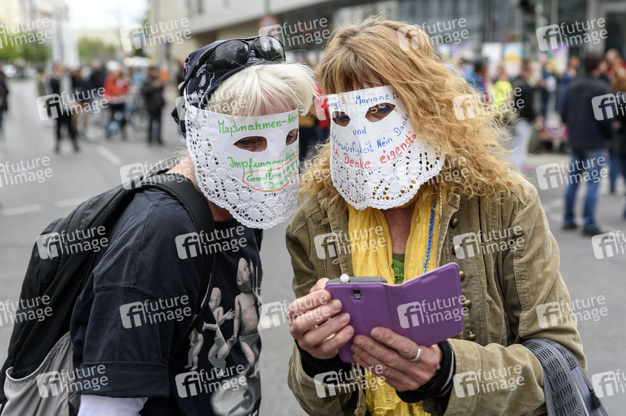 Protest der 'Kommunikationsstelle Demokratischer Widerstand Berlin' gegen die Einschränkung der Grundrechte durch Eindämmungsverordnung der COVID-19-Pandemie im Rahmen des Infektionsschutzes vor der Berliner Volksbühne. Die Demonstranten protestieren gegen die Einschränkung des Versammlungsrechts durch das Kontaktverbot und relativieren die Gefahr durch das Corona-Virus. Auch diese 5. Hygienedemo wurde durch die Polizei aufgelöst. Die Polizei nahm mehrere Personen fest. An dem Protest beteiligten sich eine Reihe von Verschwörungstheoretikern, Impfgegner aber auch rechte Gruppierungen. Berlin, 25.04.2020