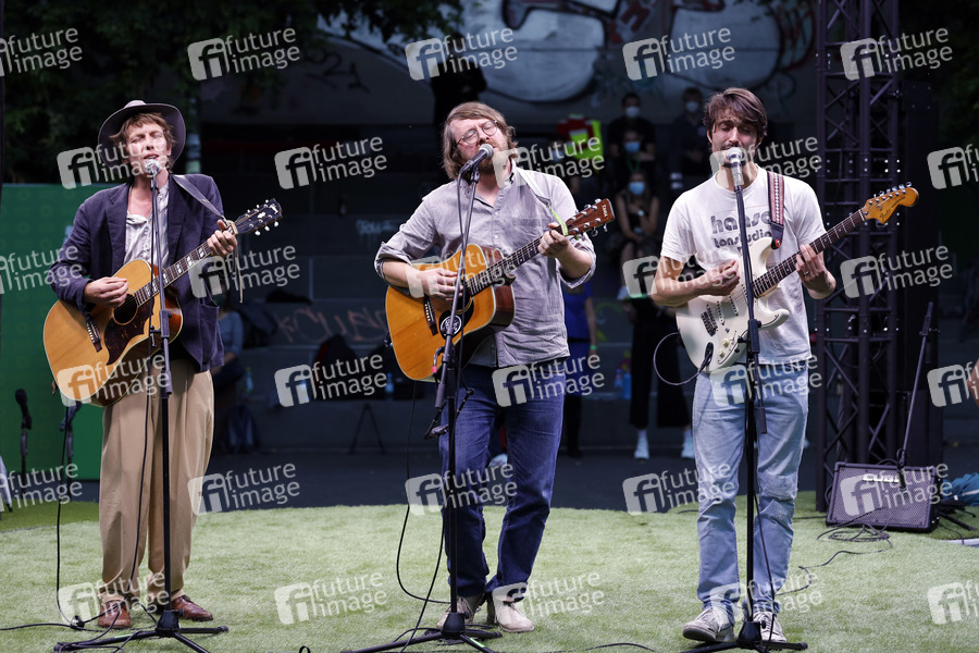 Max Prosa, Francesco Wilking und Christopher Annen bei einer Wahlkampfveranstaltung von Bündnis 90/Die Grünen auf dem Wilhelmsplatz. Köln, 02.09.2021