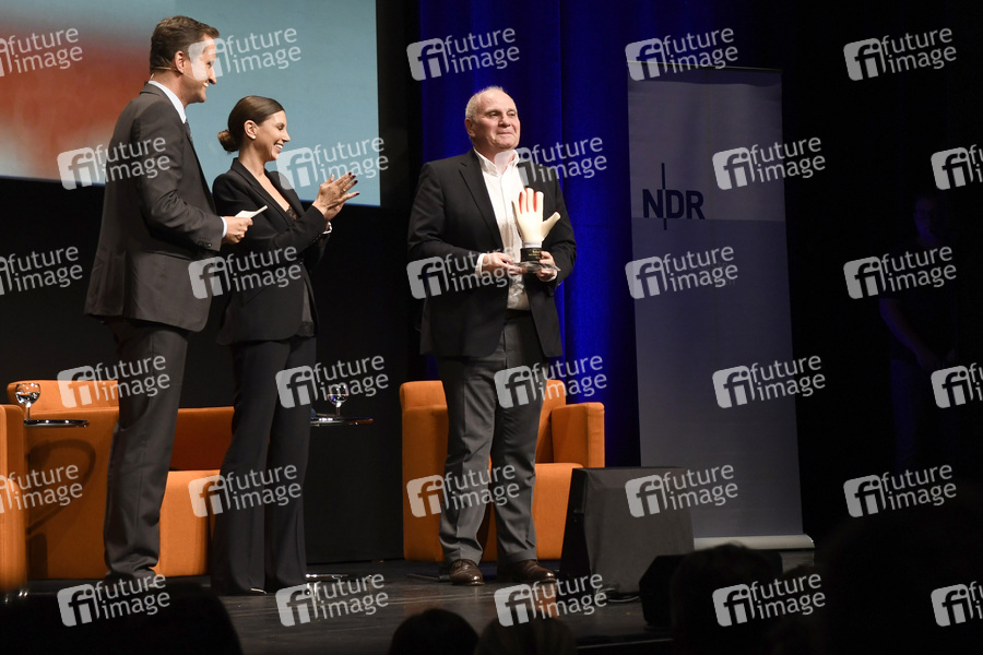 Andreas Käckell, Teresa Enke und Uli Hoeneß bei der Preview der NDR-Sendung 'Sportclub Story: Robert Enke - Auch Helden haben Depression' mit anschleißender Podiumsdiskussion im Theater am Aegi. Hannover, 04.11.2019