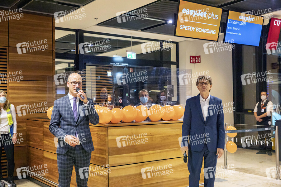 Stephan Erler und Engelbert Lütke Daldrup beim allererster kommerziellen Abflug vom BER mit easyJet nach London Gatwick am Gate im Non-Schengen-Bereich des Terminal 1 im Flughafen Berlin Brandenburg. Schönefeld, 01.11.2020