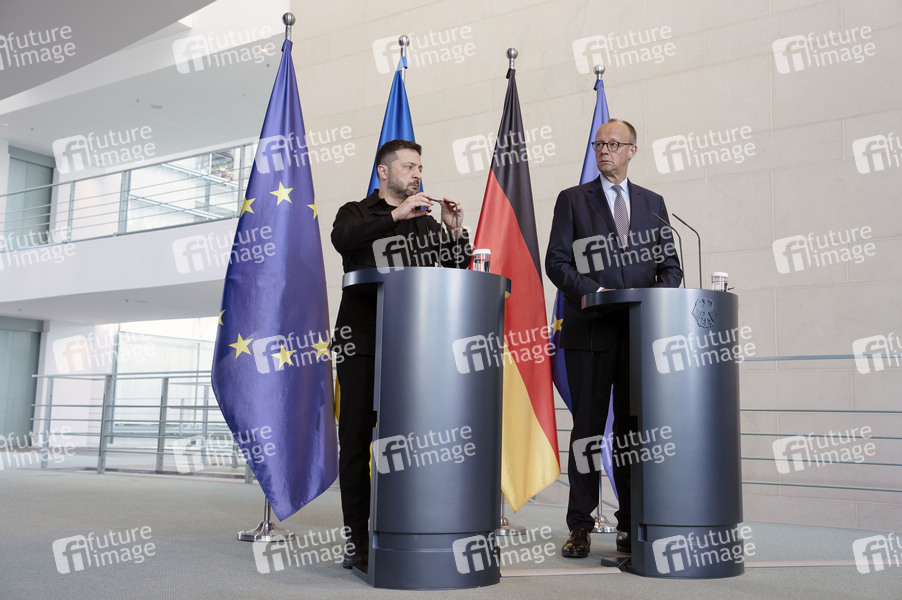 Wolodymyr Selenskyj und Friedrich Merz beim Pressestatement zum virtuellen Treffen zur Ukraine im Bundeskanzleramt. Berlin, 13.08.2025