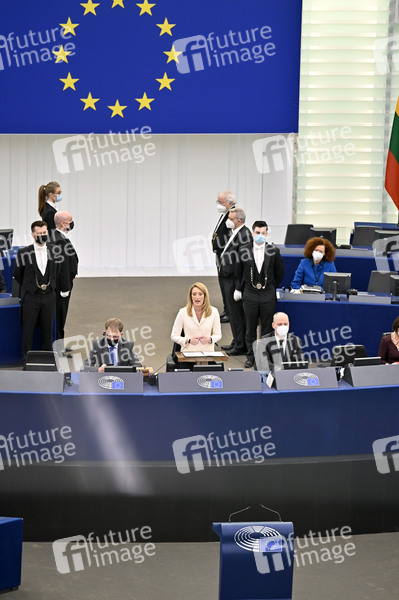Roberta Metsola nach der Wahl zur neuen EU-Präsidentin im Plenarsaal des Europäischen Parlaments. Straßburg, 18.01.2022