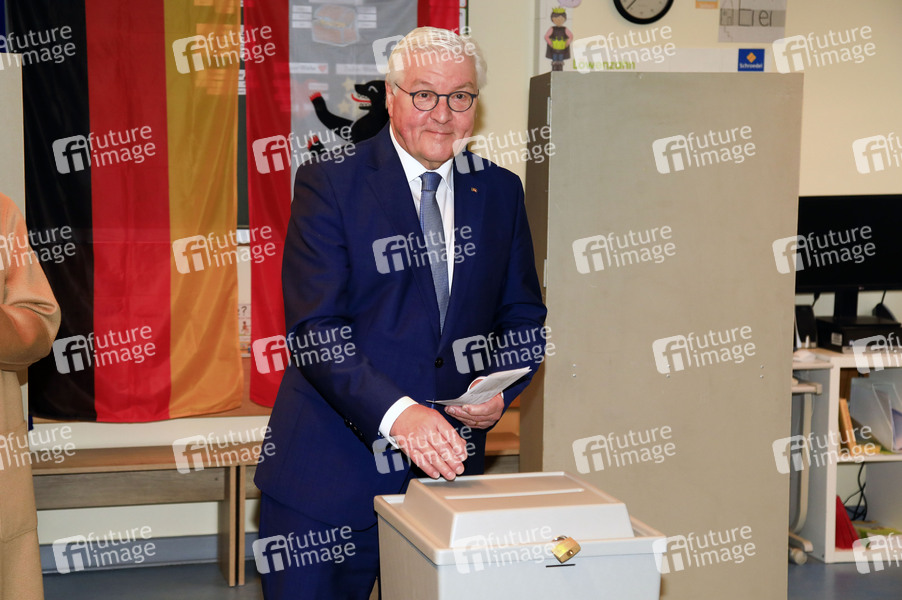 Frank-Walter Steinmeier bei der Stimmabgabe zur Bundestagswahl im Wahllokal in der Erich-Kästner-Grundschule in Berlin-Zehlendorf. Berlin, 23.02.2025