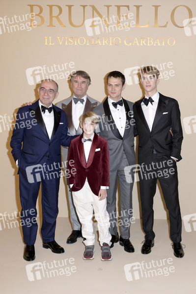 Giuseppe Tornatore, Brunello Cucinelli, Francesco Cannevale, Saul Nanni und Francesco Ferroni bei der Premiere des Kinofilms 'Brunello, il visionario garbato' in den Cinecittà Studios. Rom, 04.12.2025