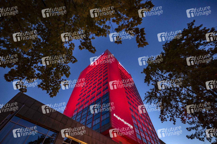 Beleuchtetes Radisson Blu Hotel - Mit der bundesweiten Aktion 'Night of Light' macht die Veranstaltungsbranche auf ihre finanzielle Notlage durch die Corona-Krise aufmerksam. Erfurt, 22.06.2020