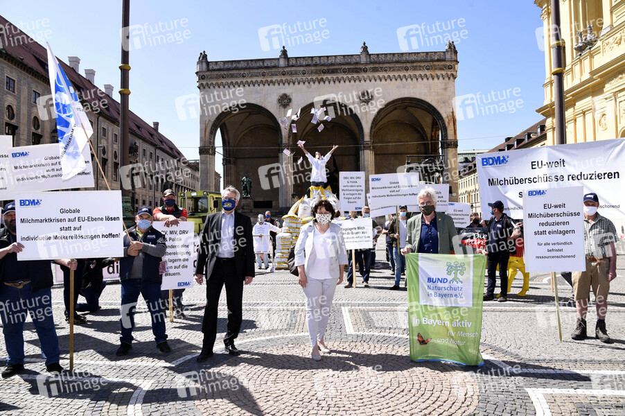 Eckbert Dauer, Ruth Müller und Richard Mergner beim Protest der Milchbauern mit Milchpyramide auf dem Odeonsplatz. München, 18.05.2020