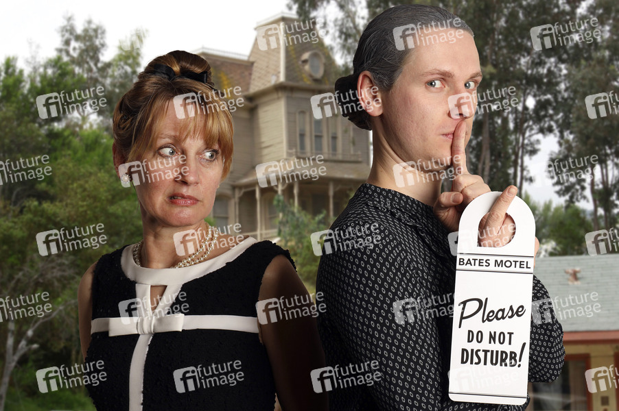 Cosplay-Photoshooting 'Psycho' mit Paul Skupin als Norman Bates und Maria Skupin als Opfer im Fotostudio Schubert. (Fotomontage mit Bates Motel im Hintergrund) Niedernwöhren, 09.01.2024