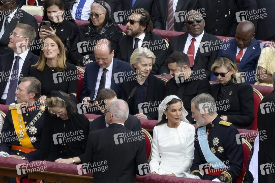 Roberta Metsola, Ursula von der Leyen, Wolodymyr Selenskyj, Olena Selenska, Königin Letizia von Spanien und König Felipe VI. von Spanien bei der Amtseinführung von Papst Leo XIV. auf dem Petersplatz. Vatikanstadt, 18.05.2025