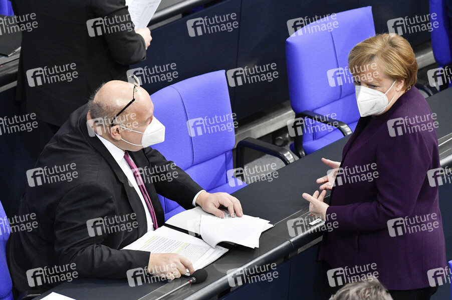 Peter Altmaier und Angela Merkel in der 205. Sitzung des Deutschen Bundestages im Reichstagsgebäude. Berlin, 27.01.2021