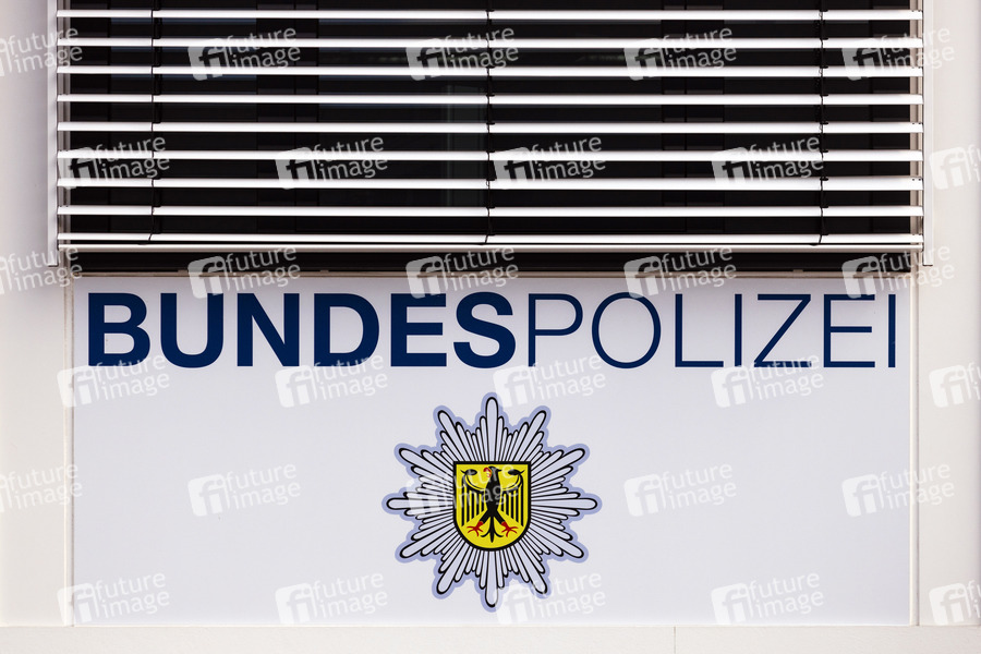 Das Logo der Bundespolizei an der Bundespolizeiinspektion in einem behelfsmäßigen Containerdorf am Kölner Hauptbahnhof. Köln, 27.08.2020