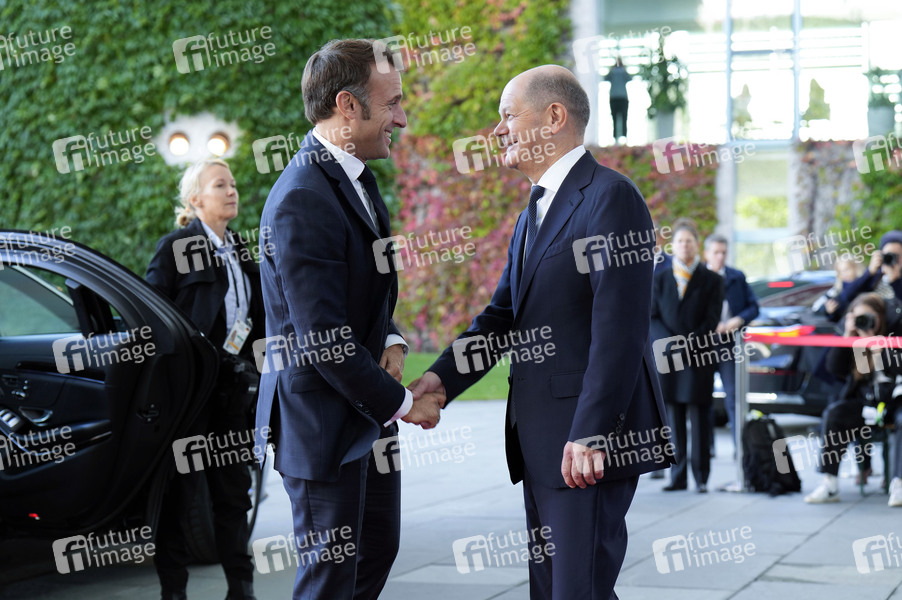 Emmanuel Macron und Olaf Scholz bei der Ankunft zum QUAD Treffen anlässlich des Besuchs des amerikanischen Präsidenten Joe Biden im Bundeskanzleramt. Berlin, 18.10.2024