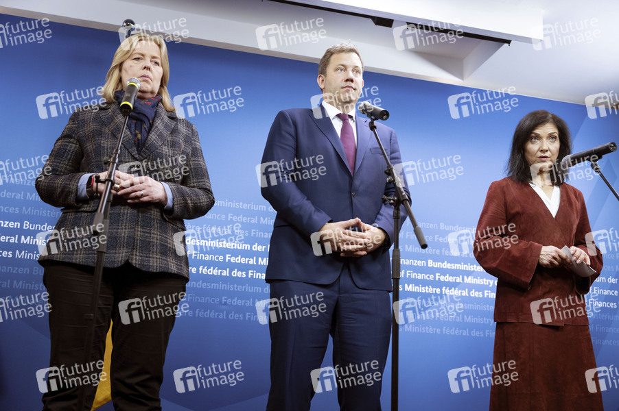 Bärbel Bas, Lars Klingbeil und Katherina Reiche beim Stahlgespräch mit Betriebsräten und Gewerkschaften im Finanzministerium. Berlin, 01.10.2025