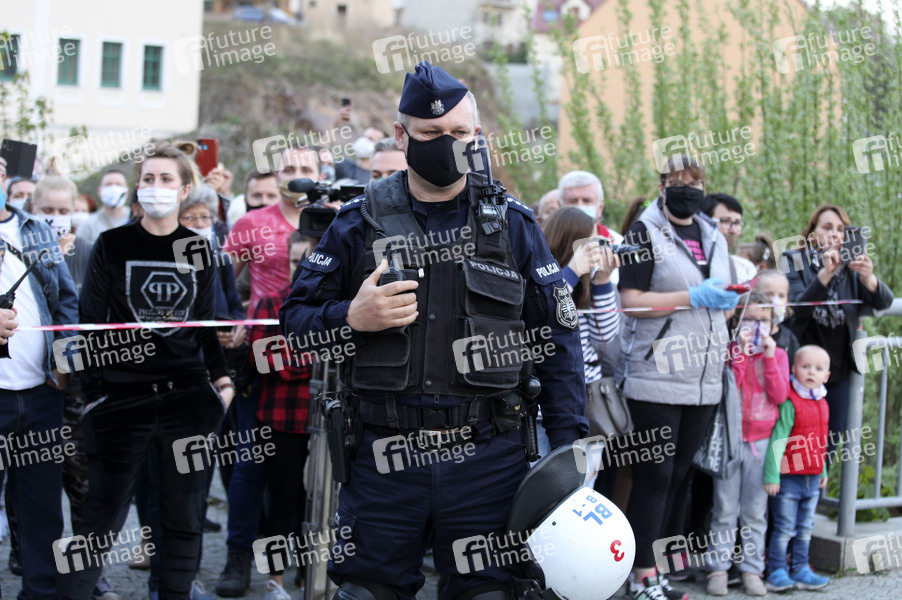 Demonstranten protestieren gegen die geschlossene Grenze zwischen Zgorzelec und Görlitz. Zur Eindämmung des Coronaviruses haben unter anderem Polen und Tschechien Mitte März die Grenzen nach Deutschland geschlossen. Hintergrund des Protestes sind die aktuellen Einschränkungen für Arbeiter, die normalerweise täglich nach Deutschland pendeln, jetzt aber nach Wiedereinreise nach Polen in zweiwöchige Quarantäne müssten. Außerdem sind grenzübergreifende, familiäre Kontakte durch die geschlossenen Grenzen nahezu ausgeschlossen. Görlitz, 24.04.2020