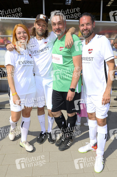 Esther Roling, Ingo Pohlmann, Dr. Thomas Mir und Kai Schwarz beim Benefiz-Fußballspiel 'Kicken mit Herz' 2022 zu Gunsten des Herzzentrums des UKE im Stadium des SC Victoria. Hamburg, 04.09.2022