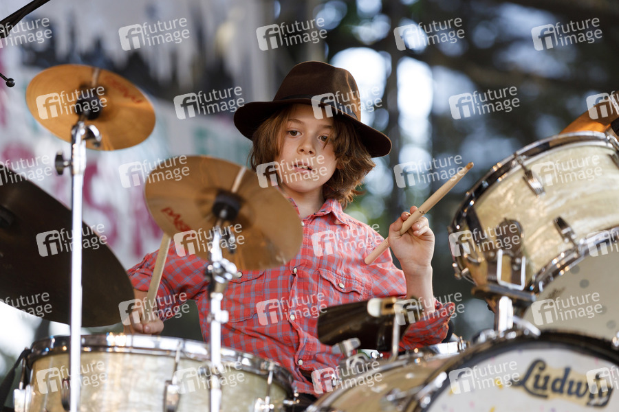 Charles Schneider, Sohn von Helge Schneider, als Drummer beim Auftritt des Vaters mit seinem Programm 'Helge - nur für Dich!' live im Tanzbrunnen. Köln, 21.08.2020