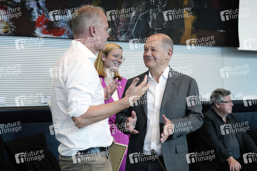 Matthias Miersch und Olaf Scholz bei der Fraktionssitzung der SPD-Bundestagsfraktion im Reichstagsgebäude. Berlin, 25.06.2024