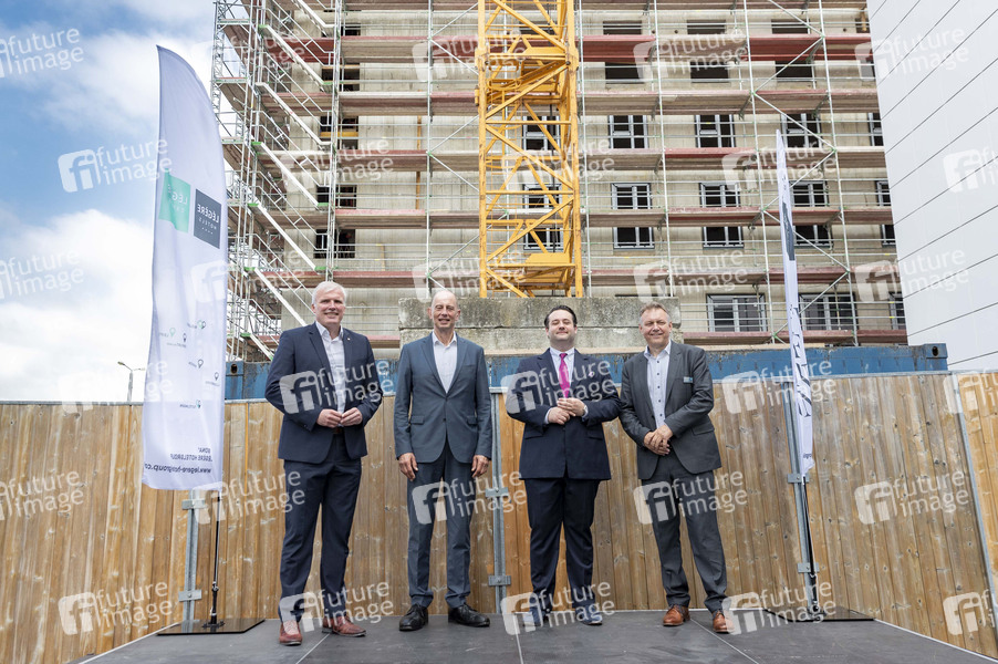 Andreas Bausewein, Wolfgang Tiefensee, Sven J. Köllmann und Michael Kynast beim Richtfest des neuen Hotels an der Messe Erfurt. Die Légère Hotelgruppe übernimmt die Leitung. Erfurt, 16.07.2021