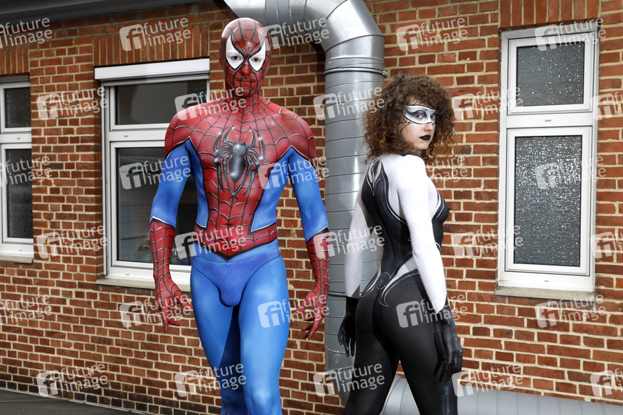 Cosplay, Cosplayer, Bodypainting, Body-Painting, Make-up, Latexappliaktionen, Latexteile, Maskenbildnerei, Maskenbildner, Körperkunst, Körperfarben, Projekt Farbkörper, Farbe, Bemalung, Kunst, Malerei, Spiderman, Comicfigur, Die Spinne, Superheld, Peter Parker, Gwen Stacy, Superheldin, Marvel, Comics, Kultur, superhero, superheroes, body painting, body art, project color body, colors