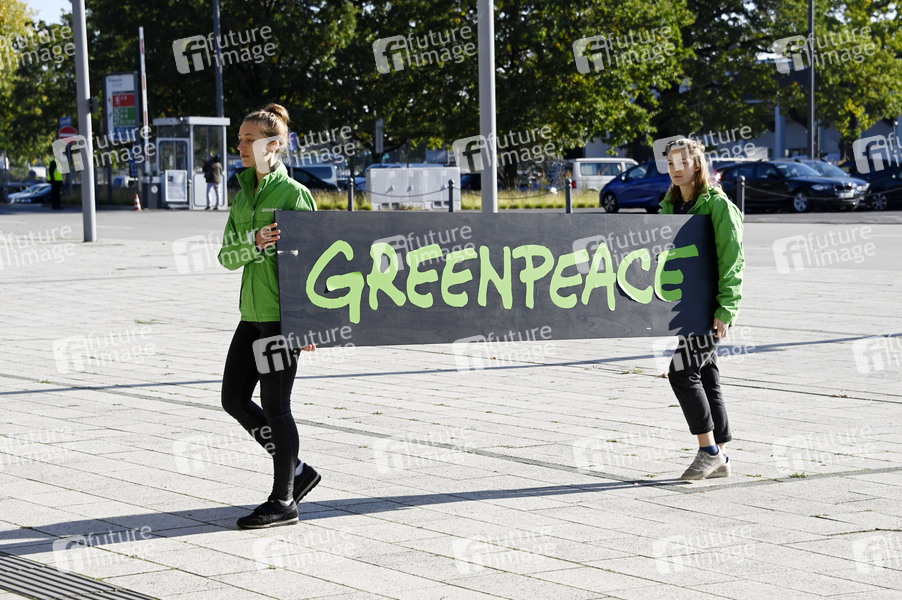 Greenpeace-Aktion zum Gespräch zwischen SPD, Bündnis 90/Die Grünen und FDP im CityCube Berlin. Berlin, 07.10.2021