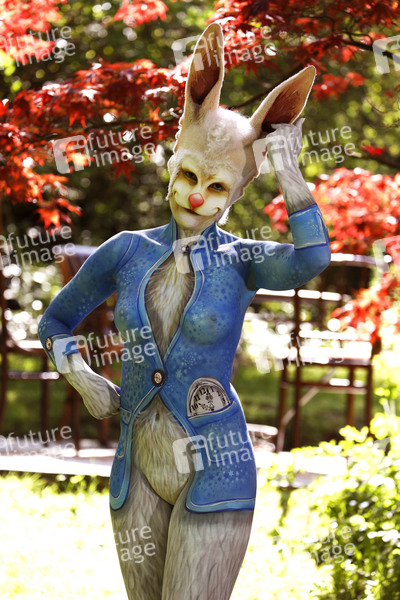 GEEK ART - Bodypainting and Transformaking: Alice im Wunderland Photoshooting mit Janina als das weiße Kaninchen im Czarnecki-Garten. Hameln, 18.05.2023 - Ein Projekt des Fotografen Tschiponnique Skupin und des Bodypainters und Transformakers Enrico Lein