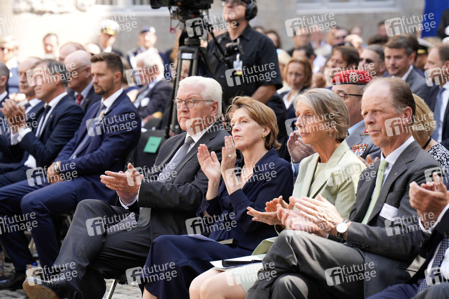 Frank-Walter Steinmeier, Elke Büdenbender, Valerie Riedesel Freifrau zu Eisenbach und Philipp Riedesel Freiherr zu Eisenbach bei der Gedenkveranstaltung zum 80. Jahrestag des Aufstands gegen Nationalsozialistische Gewaltherrschaft mit Kranzniederlegung auf dem Ehrenhof des Bendlerblocks.Berlin, 20.07.2024