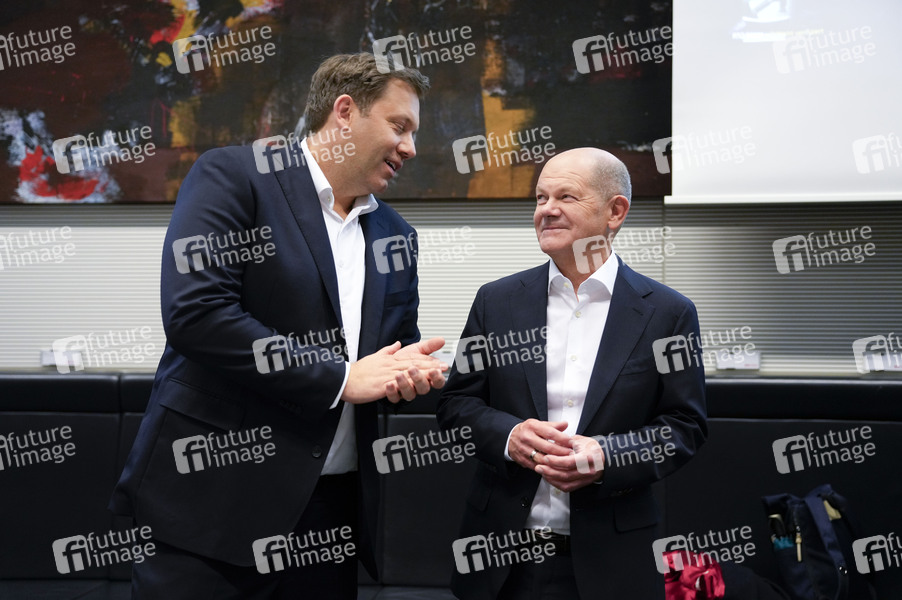 Lars Klingbeil und Olaf Scholz bei der Fraktionssitzung der SPD-Bundestagsfraktion nach dem Ampel-Aus im Reichstagsgebäude. Berlin, 06.11.2024